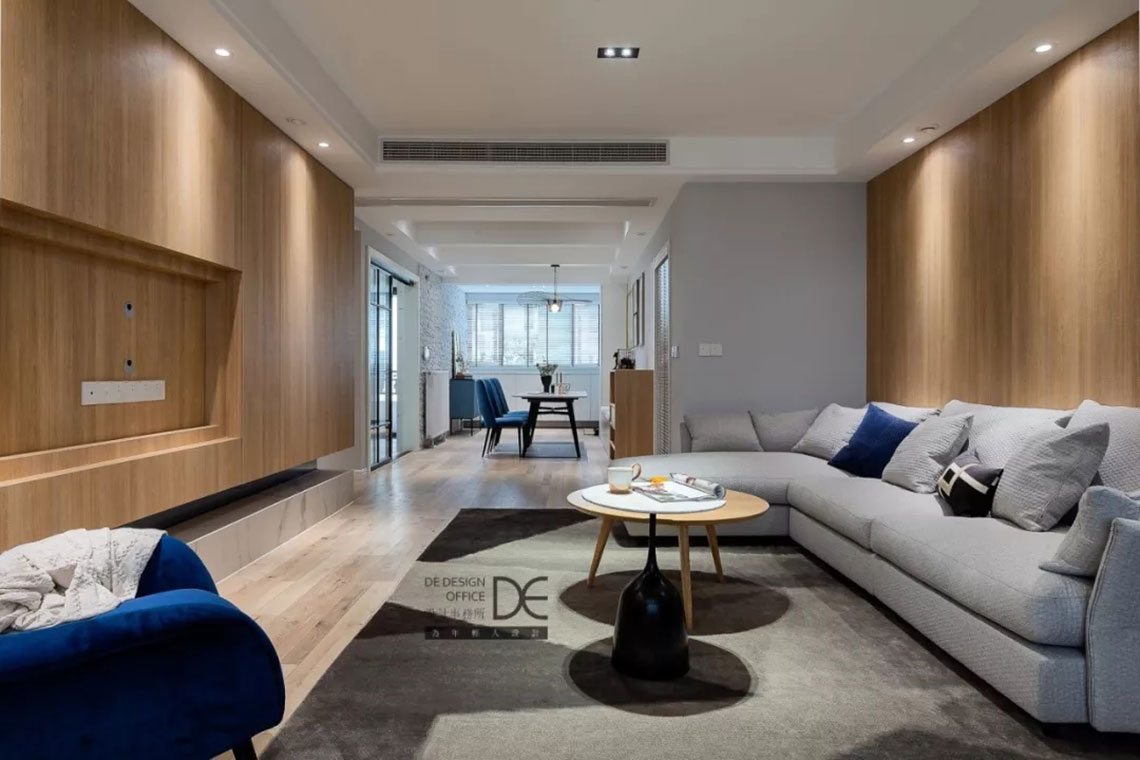 純凈的嬰兒藍墻面搭配木色飾面板,兩種色調讓客廳顯得安定,極富氣質的灰色布藝則揮灑出溫暖的氣息。