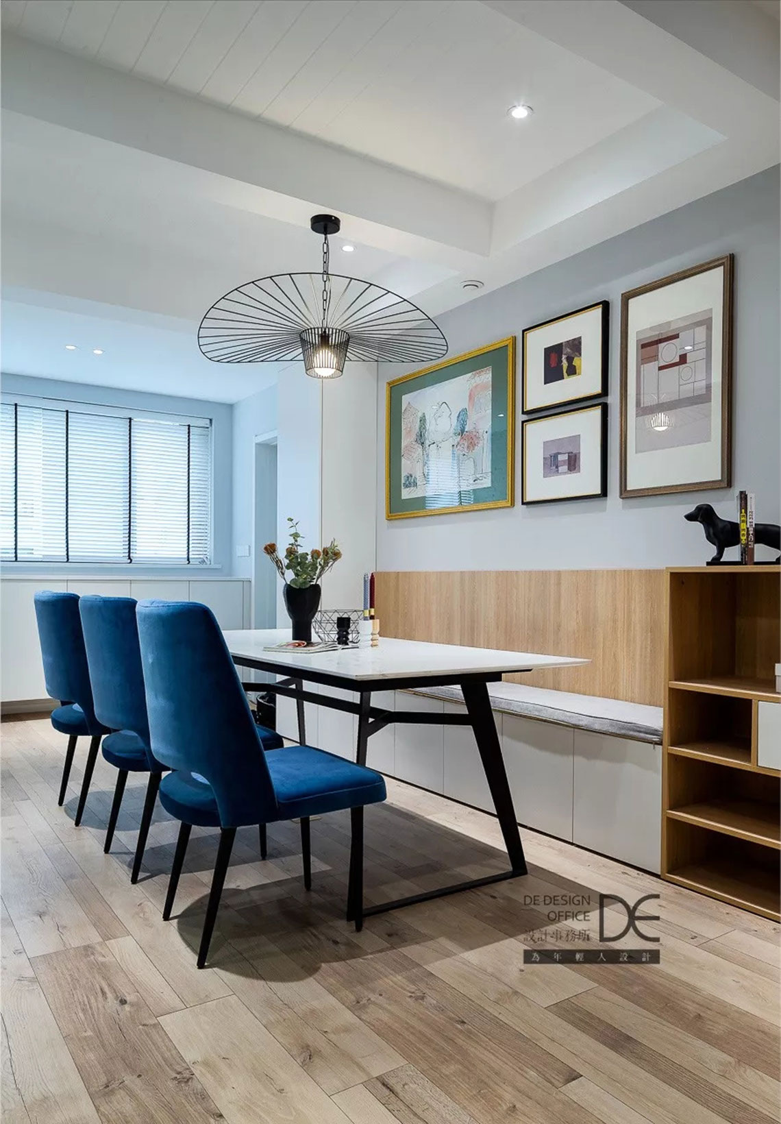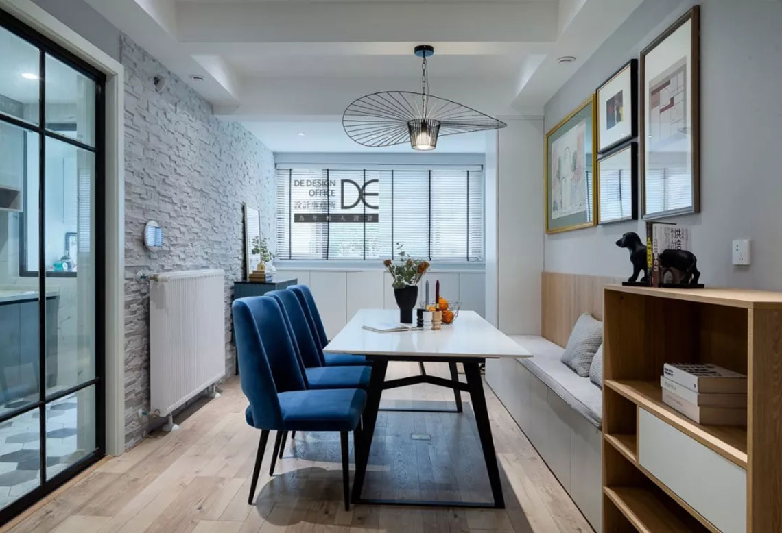 餐廳依舊是嬰兒藍色調,文化石是整個餐廳的亮點,也是入戶背景墻。