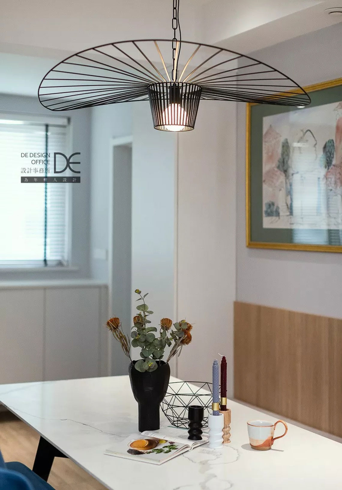 純黑草帽的吊燈就像是層疊的裙褶,既紛繁優雅又與整體的自然氣息相呼應。