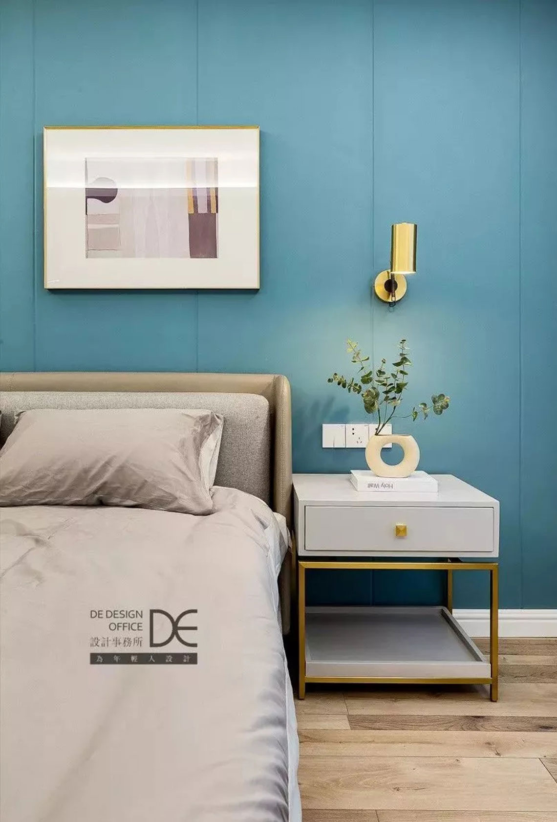 它可以搭配柔軟的棉花糖色內飾或銀色家居,點綴上金屬色澤裝飾品,整個空間顯得溫馨又富有典雅格調。最令人意想不到的金色壁燈的出現,與柔和藍的背景相融,顯得格外清涼且如夢似幻。