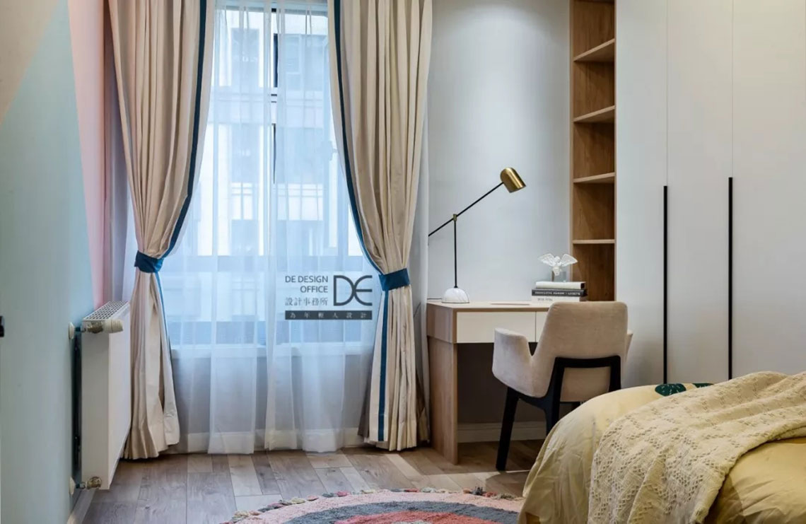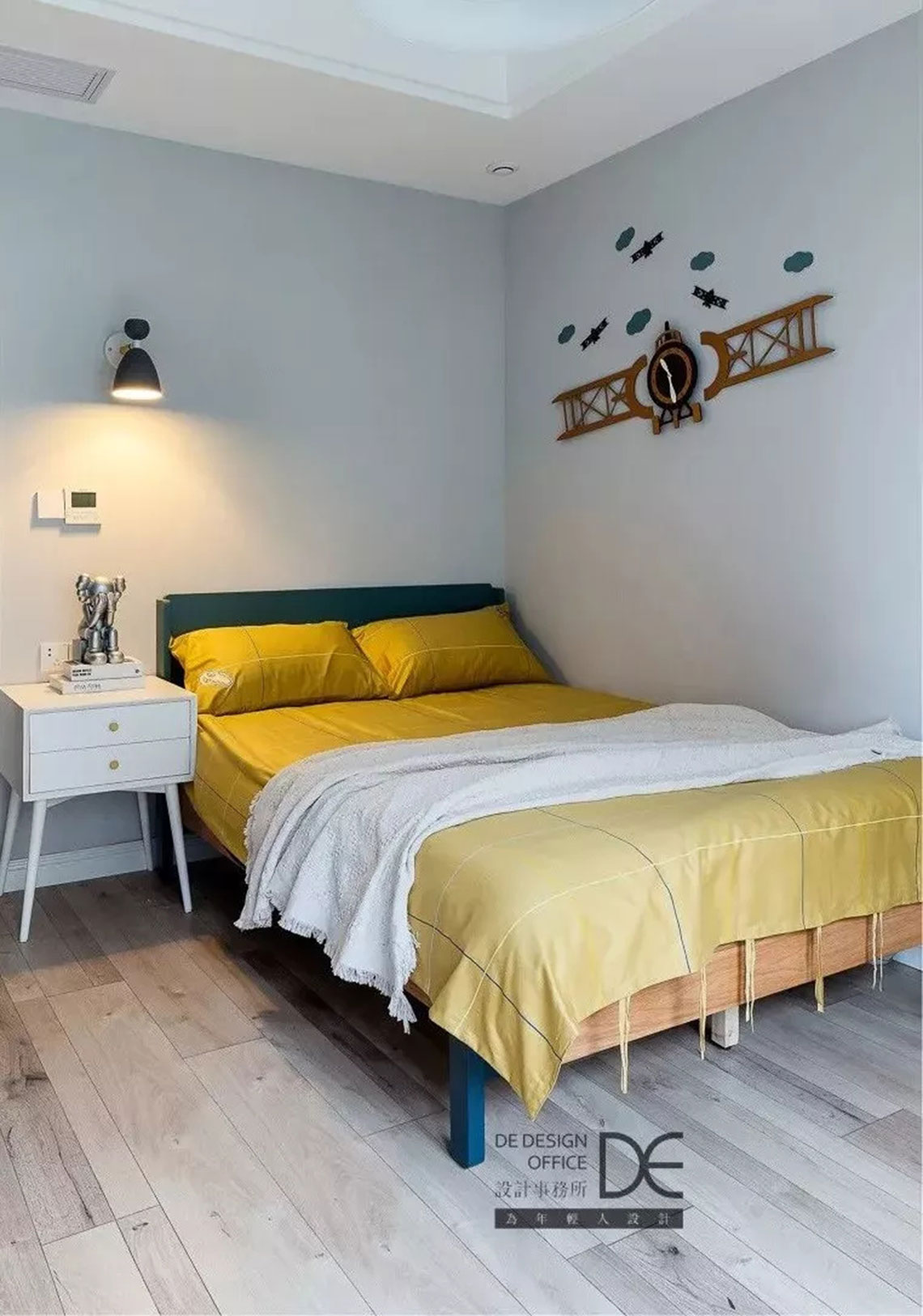 小麥色的小桌子可以擺放更多物品,也擁有更多的使用可能性——畢竟,孩子的想象力是無窮無盡的。同時,相較于嬰兒藍的清爽,它也為房間增添了溫暖和自然的質感。