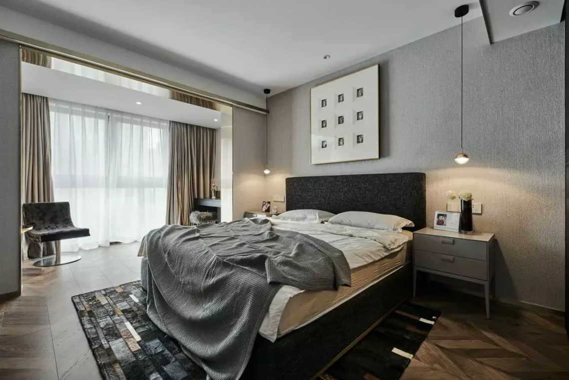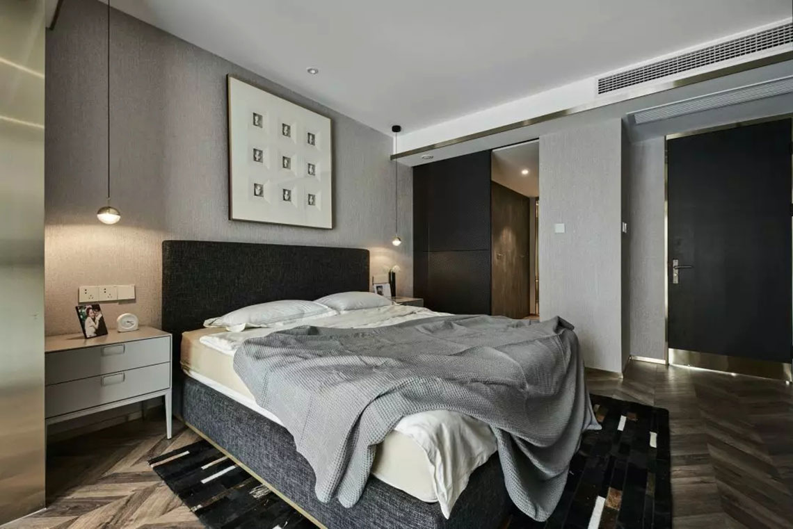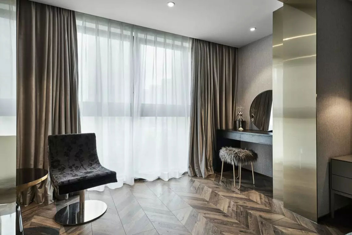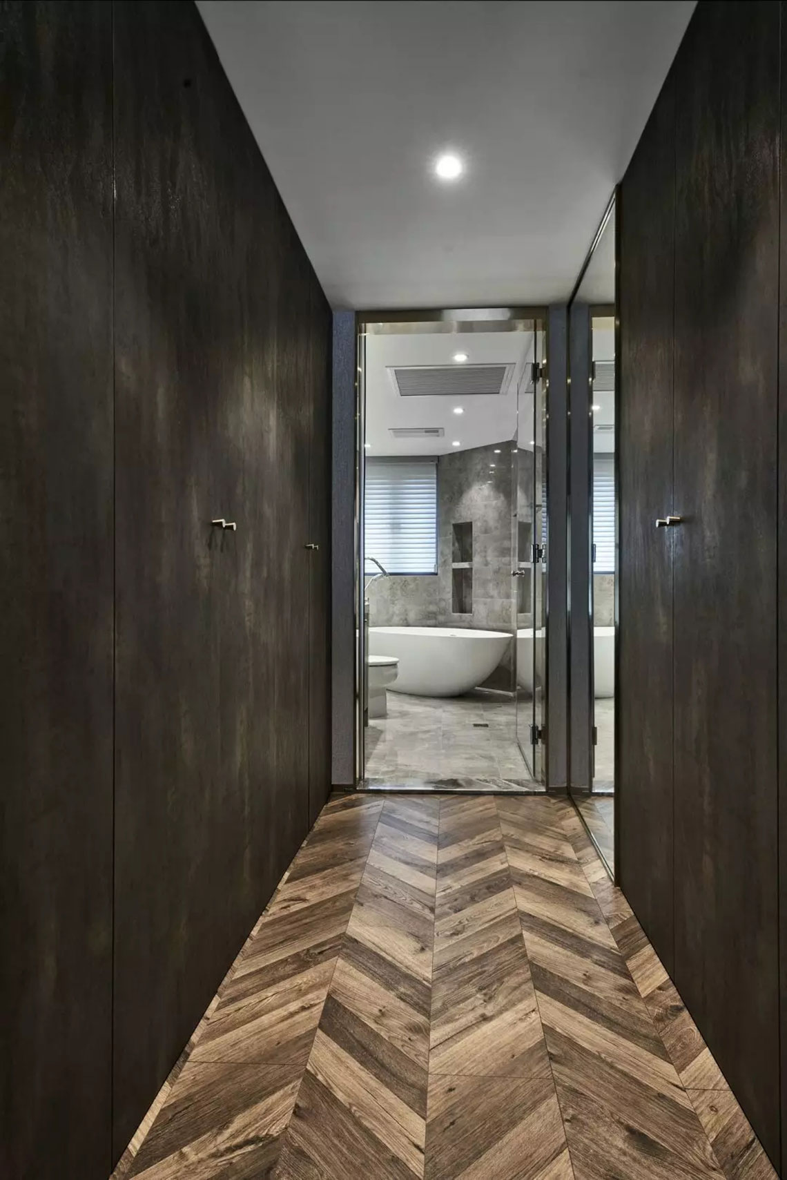 主臥連接主衛的過道中也使用了凱得魚骨拼地板,這使得兩個空間在材質和視覺上都得到了關聯性延伸,木色緩解其它材質帶來的冰涼感,賦予家溫暖自在的氣息,其創造性的魚骨拼接方法也讓空間看起來更加高級美觀。
