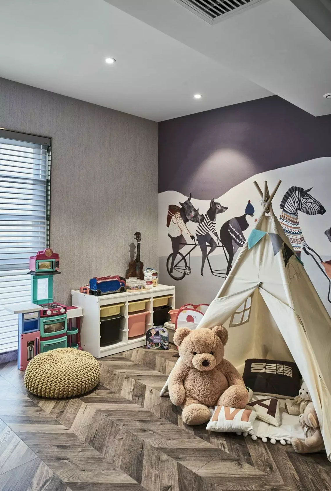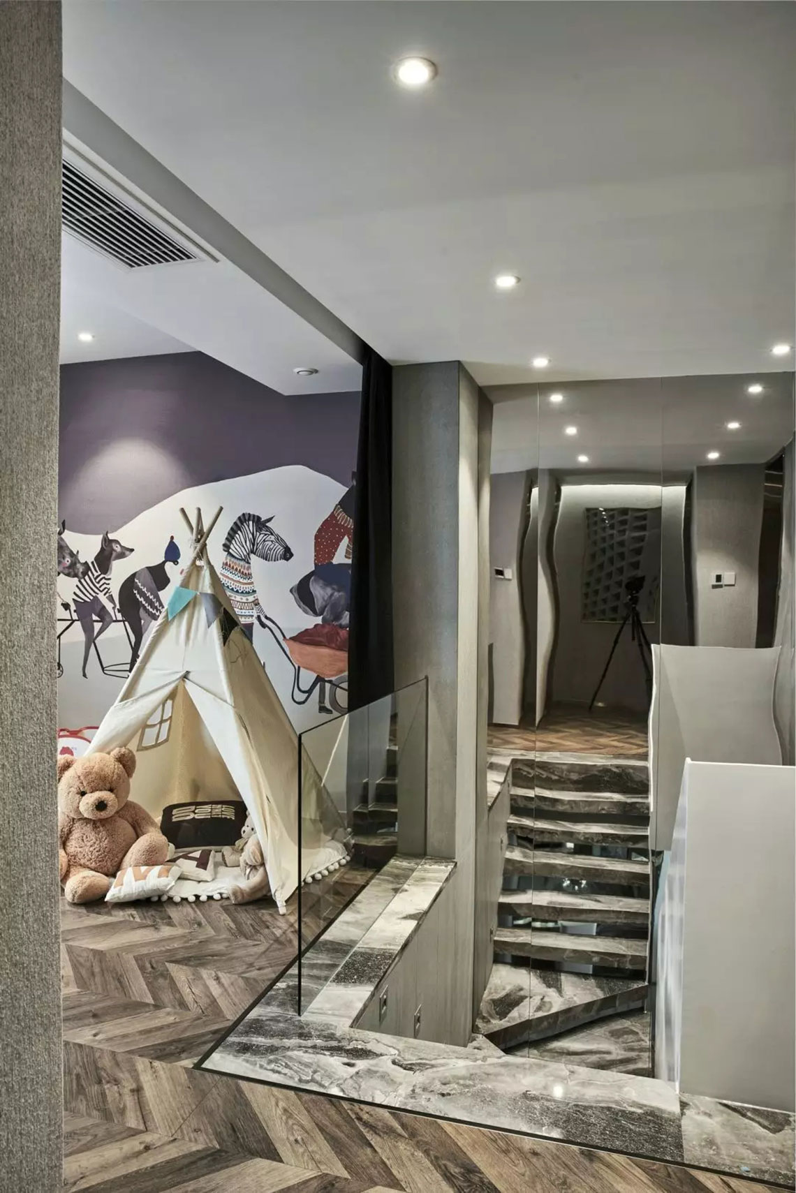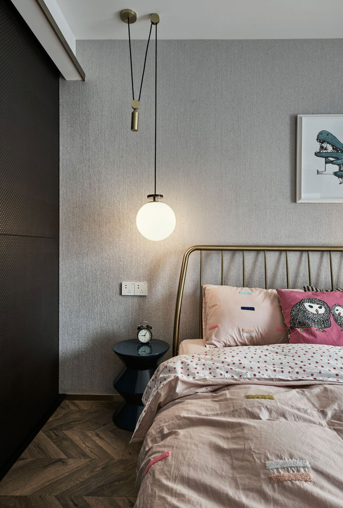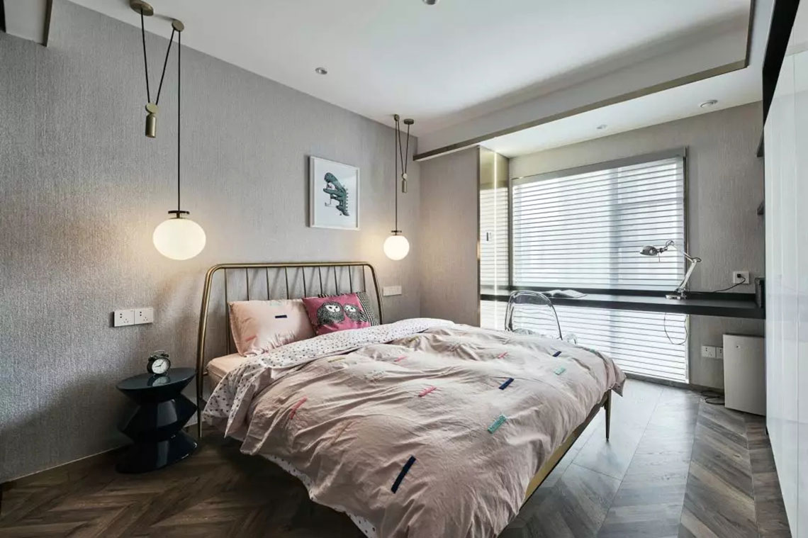 主臥連接主衛的過道中也使用了凱得魚骨拼地板,這使得兩個空間在材質和視覺上都得到了關聯性延伸,木色緩解其它材質帶來的冰涼感,賦予家溫暖自在的氣息,其創造性的魚骨拼接方法也讓空間看起來更加高級美觀。