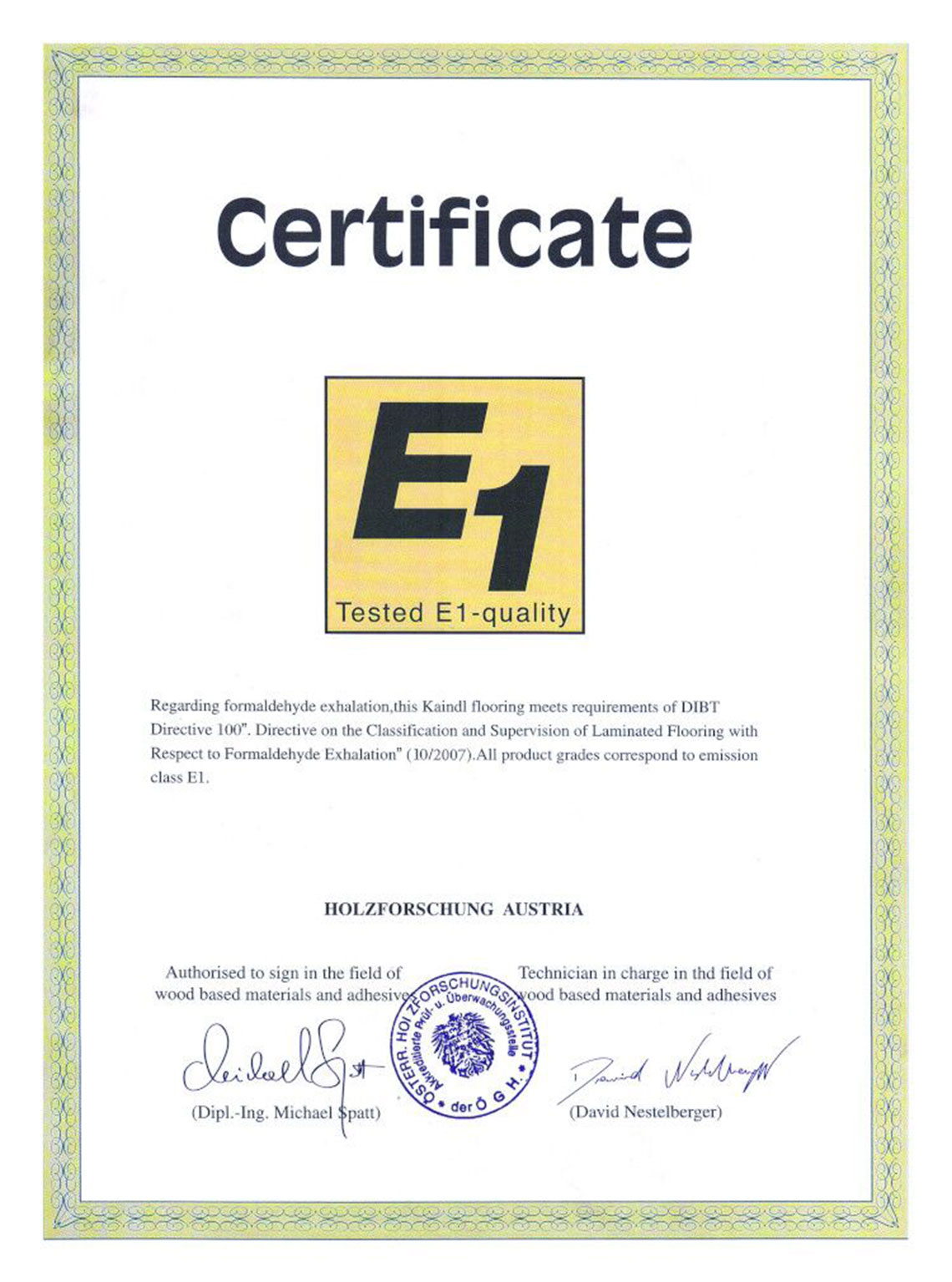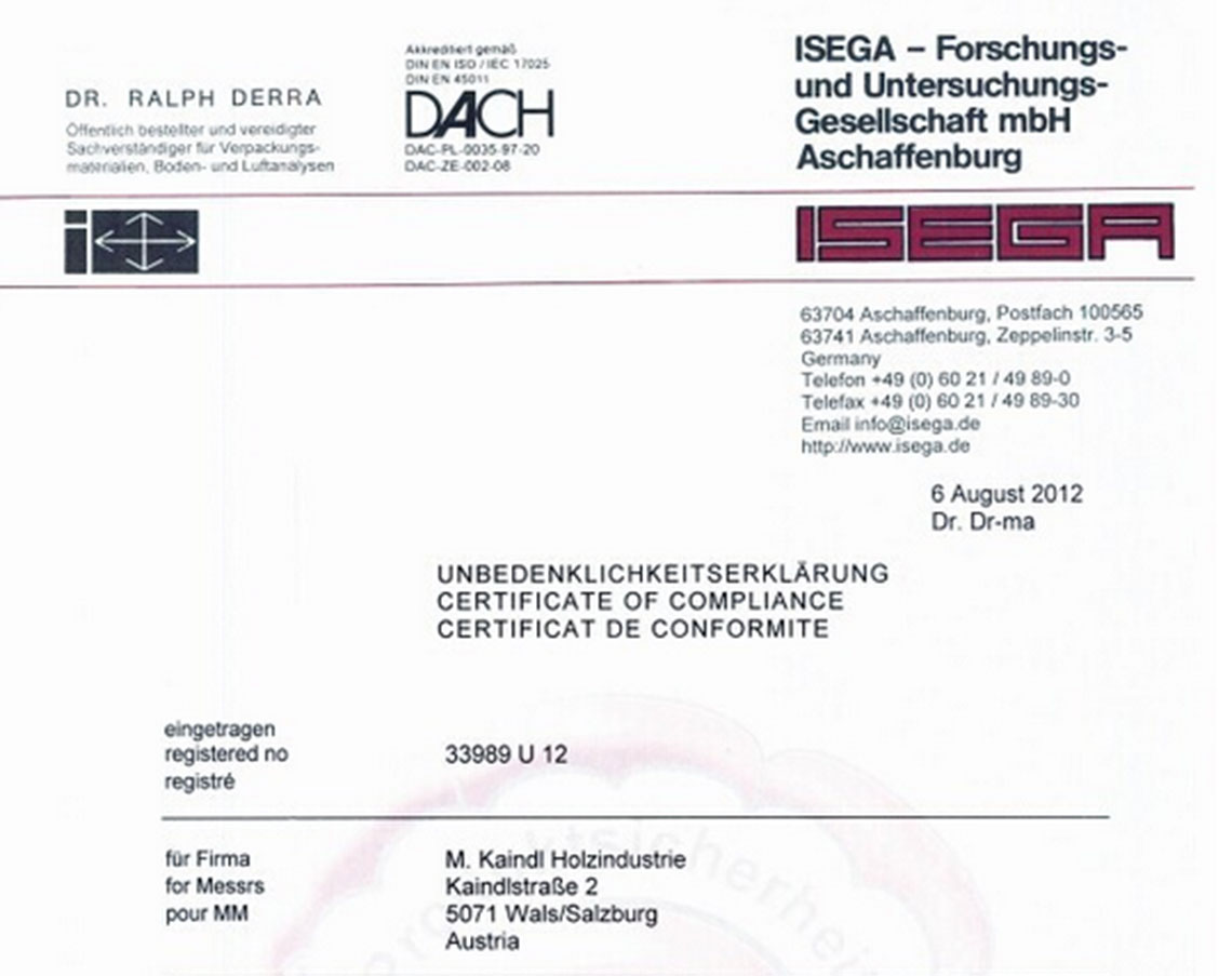 凱得集團(tuán)的產(chǎn)品滿足嚴(yán)格的質(zhì)量標(biāo)準(zhǔn)和環(huán)境標(biāo)準(zhǔn),這一些并非空口白談,而是均由獨立的測試機(jī)構(gòu)所證明的事實。相關(guān)機(jī)構(gòu)如奧地利木材外部質(zhì)量控制研究所、Fraunhofer WKI機(jī)構(gòu)木材研究所以及ISEGA歐洲食品級認(rèn)證等機(jī)構(gòu)會定期監(jiān)測和認(rèn)證凱得地板的產(chǎn)品質(zhì)量,并頒發(fā)相關(guān)環(huán)保證書。