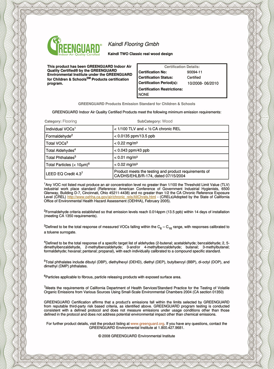 GREENGUARD室內(nèi)空氣質(zhì)量認(rèn)證是針對室內(nèi)材料、家具以及構(gòu)造系統(tǒng)的低揮發(fā)產(chǎn)品的認(rèn)證項目。檢測方法依據(jù)GREENGUARD的“動態(tài)環(huán)境控制艙內(nèi)檢測化學(xué)揮發(fā)方法”的檢測方法,所有產(chǎn)品將在動態(tài)環(huán)境控制艙內(nèi)被檢測。通過對75,000多種不同行業(yè)的產(chǎn)品進(jìn)行化學(xué)物質(zhì)排放檢測研究,能夠確認(rèn)釋放到空氣中的12,000多種揮發(fā)性有機(jī)化合物,從而保證室內(nèi)空氣質(zhì)量。獲得GREENGUARD認(rèn)證的凱得地板,也證明通過了世界上權(quán)威的室內(nèi)空氣質(zhì)量認(rèn)證測試。