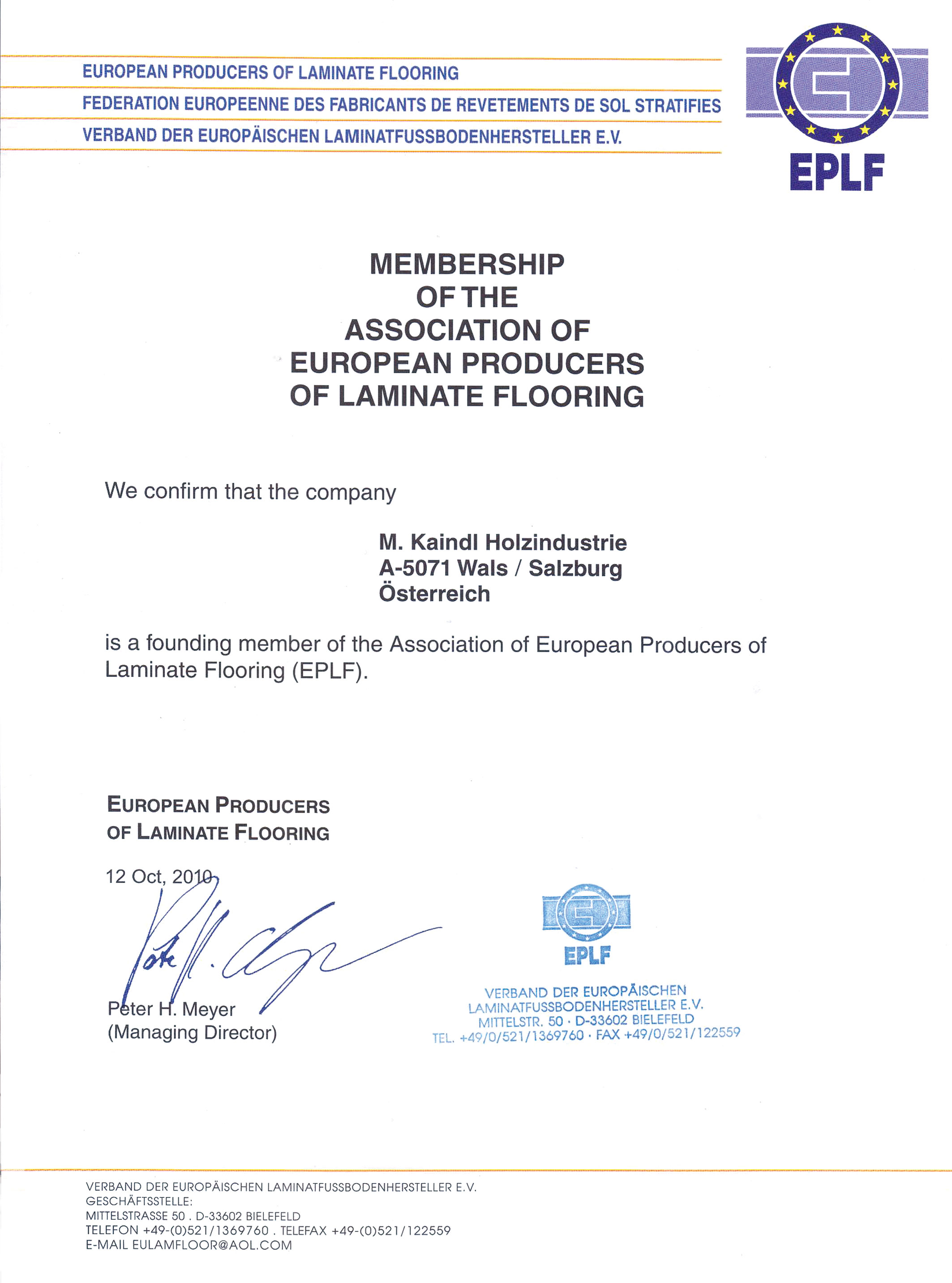EPLF代表歐洲地區(qū)強(qiáng)化木地板行業(yè)的主導(dǎo)企業(yè)及其供應(yīng)商,1994年在德國波恩建立,后來把總部設(shè)在比勒費爾德市,目前協(xié)會有來自歐洲11個國家的的17個企業(yè),還有31個原料供應(yīng)商和4個檢測機(jī)構(gòu)。只有全球銷量排名前列的地板品牌才能成為EPLF成員,據(jù)EPLF統(tǒng)計,該協(xié)會成員地板銷售量占全球強(qiáng)化木地板總銷量的55%,占?xì)W洲市場的80%。奧地利凱得集團(tuán)有幸成為EPLF歐洲木地板協(xié)會成員。