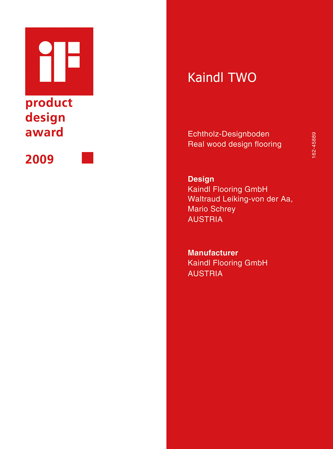 IF漢諾威工業(yè)設(shè)計大獎創(chuàng)立于1953年,該獎是由德國歷史最悠久的工業(yè)設(shè)計機(jī)構(gòu)--漢諾威工業(yè)設(shè)計論壇(Industrie Forum Design)每年定期舉辦的。德國IF國際設(shè)計論壇每年評選iF設(shè)計獎,它以“獨立、嚴(yán)謹(jǐn)、可靠”的評獎理念聞名于世,旨在提升大眾對于設(shè)計的認(rèn)知,其最具分量的金獎素有“產(chǎn)品設(shè)計界的奧斯卡獎”之稱。KAINDL TWO全系列產(chǎn)品獲得了此獎項,在行業(yè)內(nèi)至今一枝獨秀。