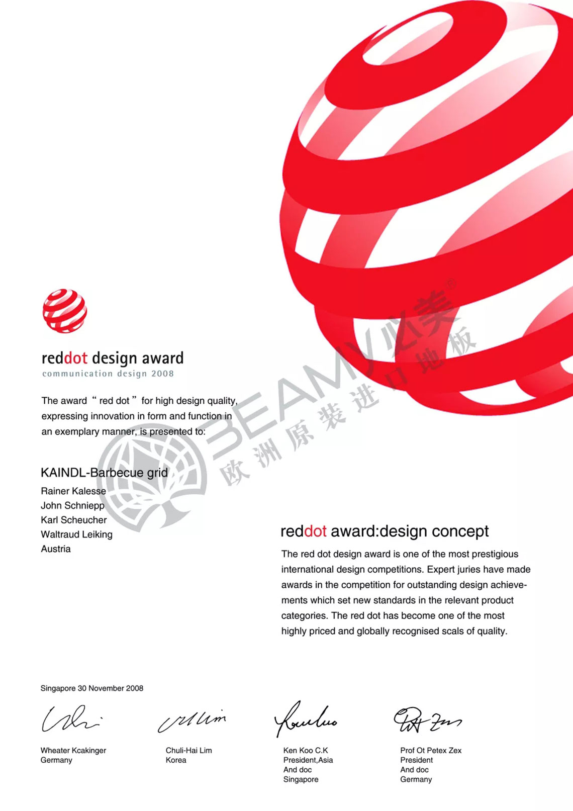Red Dot Award德國紅點設(shè)計大獎是德國工業(yè)設(shè)計協(xié)會創(chuàng)立的全世界工業(yè)設(shè)計領(lǐng)域的最高獎項,相當(dāng)于娛樂界的奧斯卡,它代表了好設(shè)計與創(chuàng)新能力的品質(zhì)認(rèn)證,只有在全球設(shè)計競爭中脫穎而出的人和產(chǎn)品,方能擁有此認(rèn)證標(biāo)志專屬使用權(quán)。紅點產(chǎn)品設(shè)計大獎從1954年開始至今,已成為全球規(guī)模最大,最受尊崇的設(shè)計競賽之一。奧地利凱得地板憑借出色的產(chǎn)品設(shè)計獲得了紅點設(shè)計大獎。