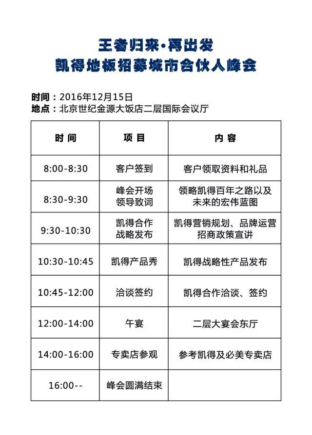 請有意向參加凱得地板招商會的經銷商,于2016年12月8日前,聯系程先生(電話:18688410598;QQ:691013597)取得并填好報名回執表并傳真到必美集團客服部。傳真號碼:020-38814188,肖春媚收。客服郵箱:beamyworld@126.com