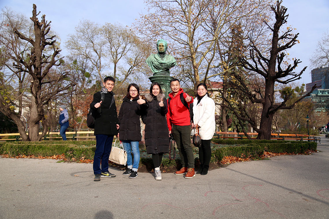 11月末的維也納大部分情況下天氣是晴朗的,平均氣溫2℃~8℃,偶爾會下起雨夾雪。考察團抵達維也納后的第一站是參觀維也納城市公園,城市公園位于老城區東部環形大道內側,是維也納最受游客歡迎的公園。天朗氣清,冬日的維也納公園并不蕭肅,各種不知名的鳥兒成群結隊在公園里悠閑地“散步”,偶遇一個騎著自行車而過的路人,頗有“驚起一灘鷗鷺”的景象。
