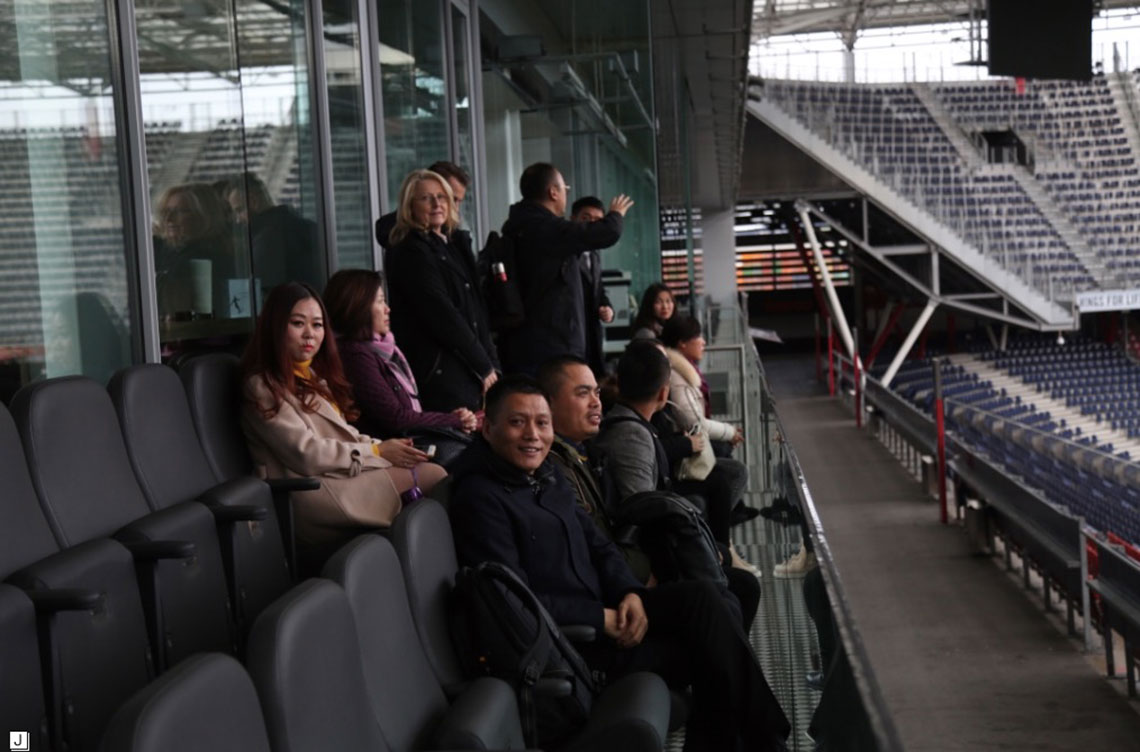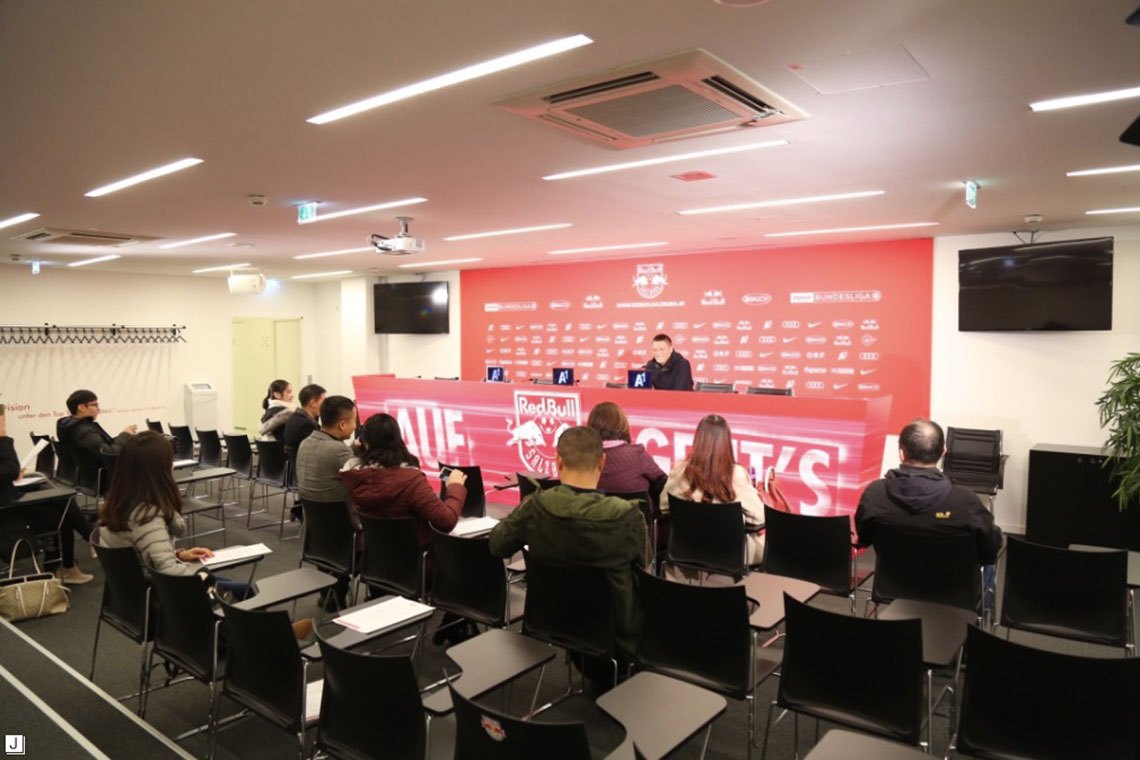 抵達奧地利薩爾茨堡后,考察團在著名的紅牛足球隊餐廳用餐。午餐后參觀當地著名的薩爾茨堡紅牛體育館,球場外大大的紅牛logo向世人宣示著這是薩爾茨堡紅牛足球俱樂部的主場體育場,是奧地利最大的球場之一,先進的球場也為薩爾茨堡增色不少。隨后,考察團一行進入紅牛足球隊新聞發布廳。