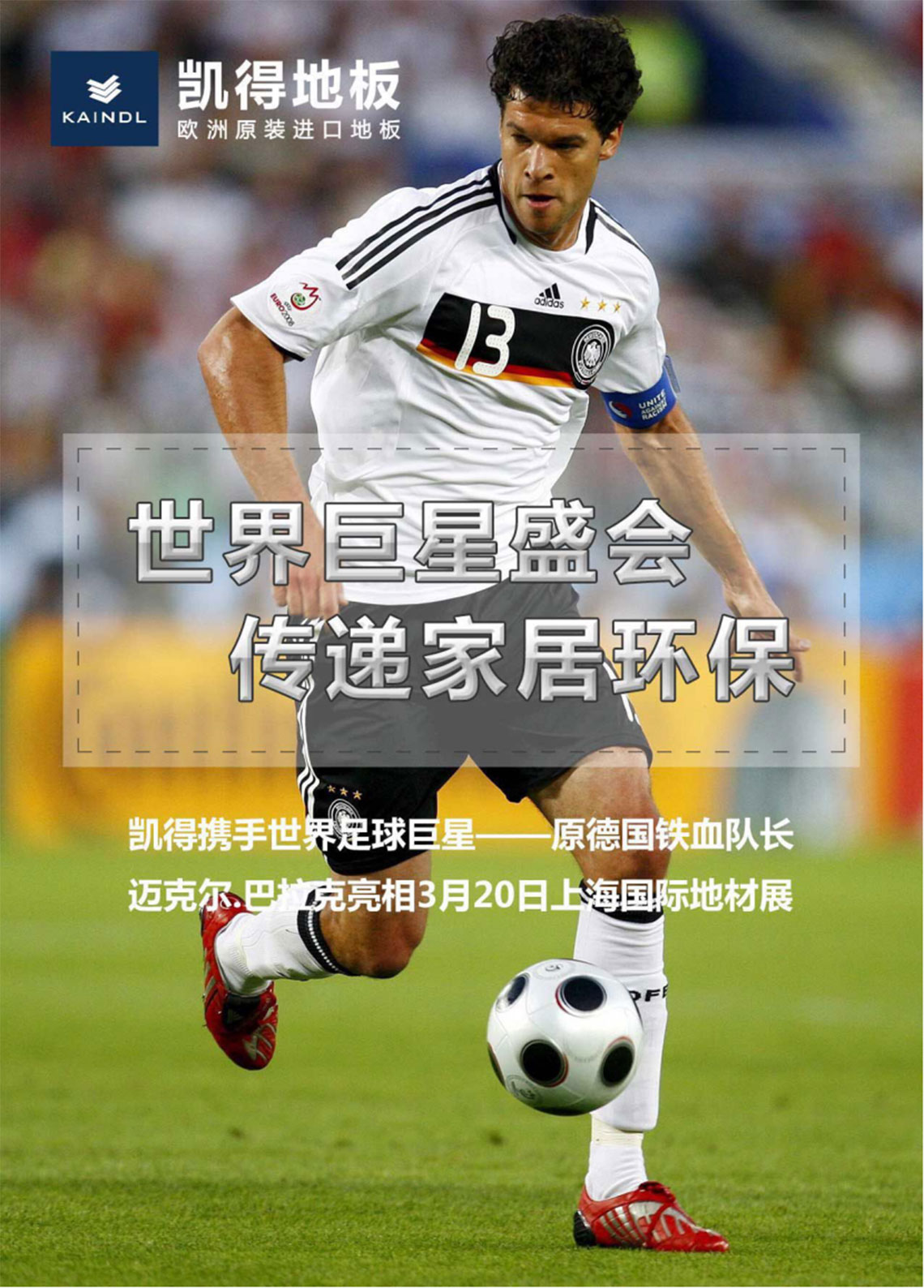 “中國的球迷朋友,我是邁克爾.巴拉克,大家好!用環保傳遞愛,打造中國幸福家。3月20我在上海新國際展覽中心凱得地板展館,與您不見不散!”