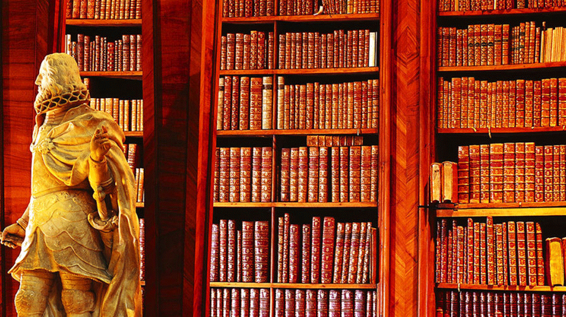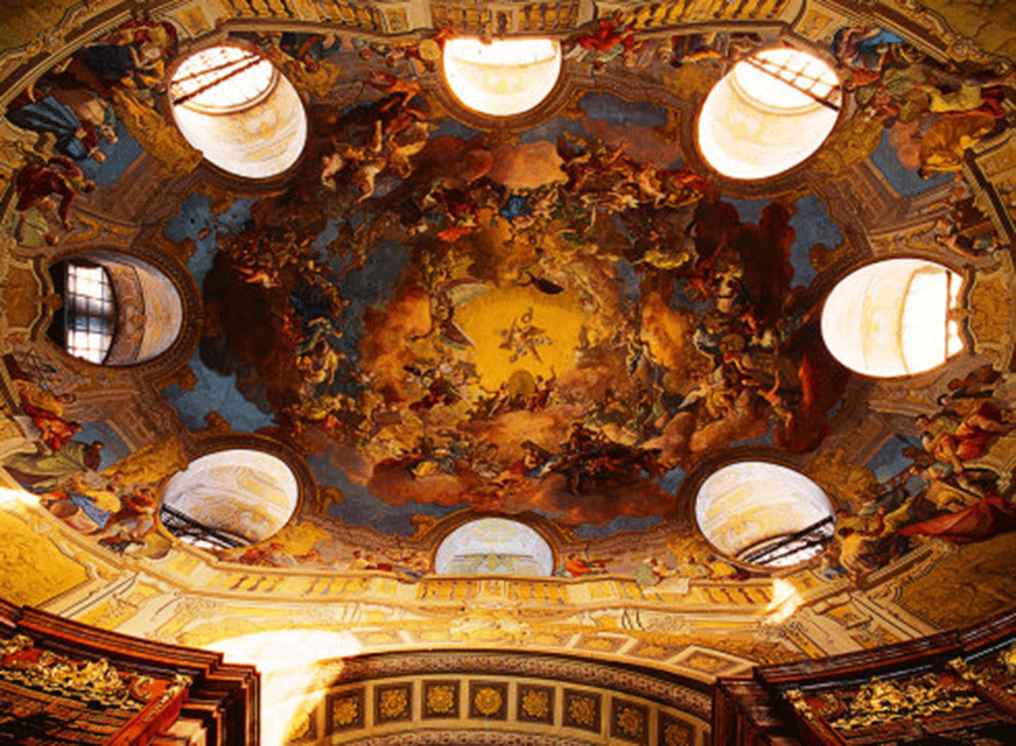 不同年代,種類繁多的收藏書籍,密集地排列在古色古香的褐色木制書架上。穹頂和側廊的巨幅壁畫,與嵌入墻壁的雕刻書柜渾為一體,使人仿佛時而遨游于浩瀚書海,時而又置身于藝術宮殿,美得叫人無法看書。整座圖書館最讓人驚嘆的地方當屬中間的豪華大廳,大廳中間是卡爾六世皇帝的等高全身雕像,展示了卡爾六世對知識的尊重,周圍廊柱上的是16位哈布斯堡王朝皇帝雕像,極富皇家氣派,這里也是大量收藏過馬丁.路德寫作筆記的圖書館之一,是歐洲乃至世界上最早可供公眾使用的皇家圖書館。