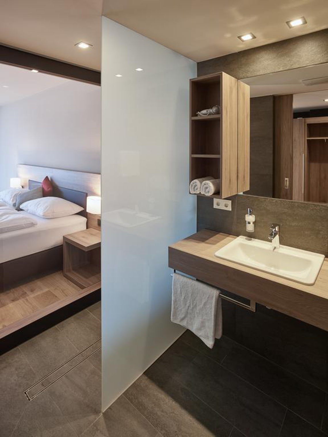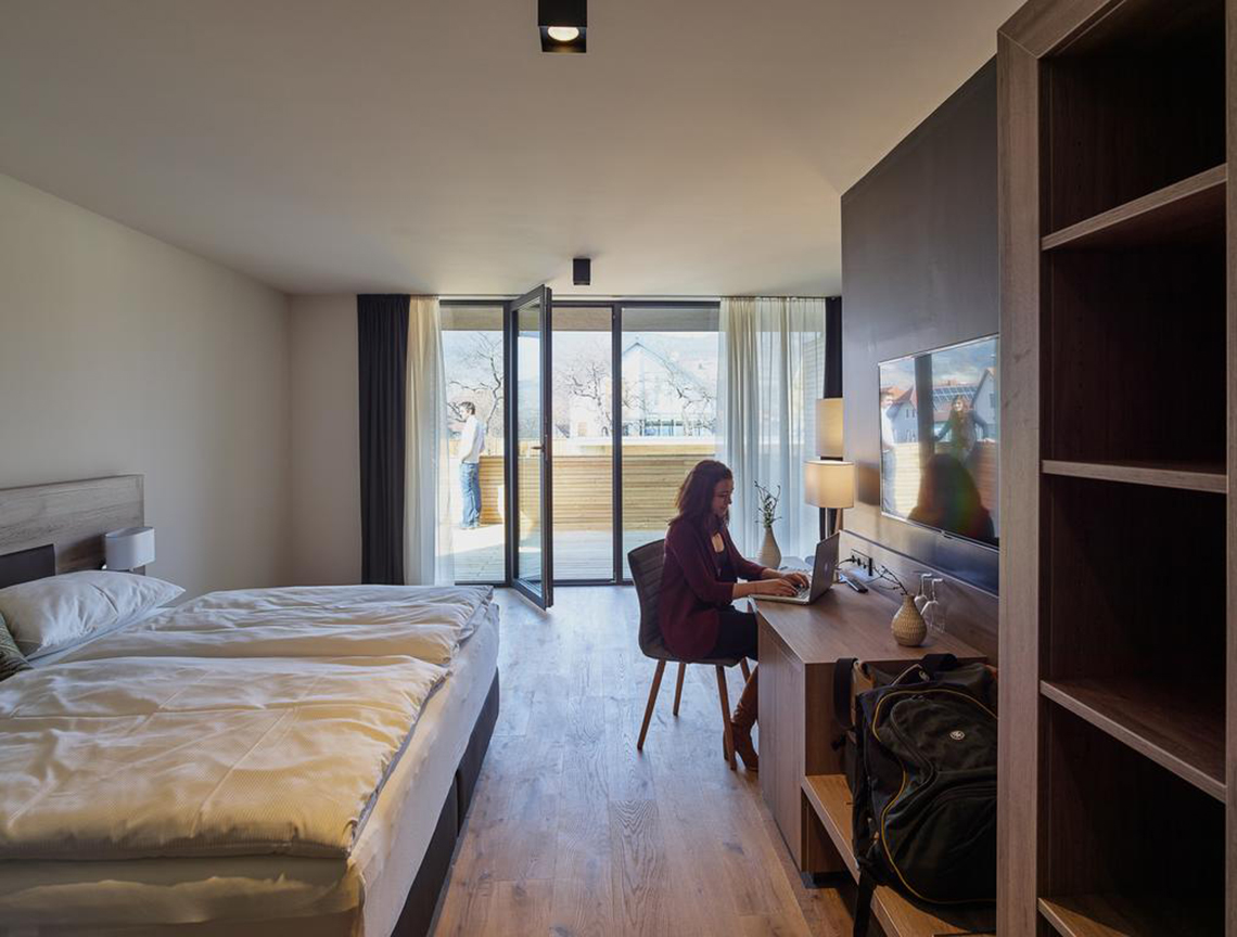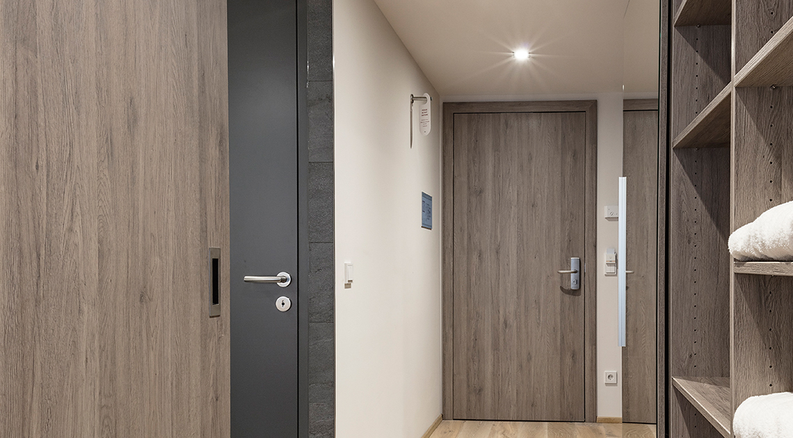酒店對客房的裝飾十分考究,每間設施齊全的客房都配備有房內保險箱、衣柜和衣櫥,還提供了一個陽光露臺。奧地利百年地板品牌凱得的身影在客棧內隨處可見,凱得在融入當地文化特色的基礎上對產品作了清簡的表達,利用木材營造質感。通過精致打磨的門和家具簡練大氣,每一個細節都表現得恰到好處,低調的灰色凸顯出整個空間的優雅格調,讓環境歸于質樸真元,讓客人在小屋客棧的時間里可以完全享受短暫的清閑。